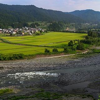 信濃川展望所 橋を渡ると十日町市、千曲川は信濃川に名前を変えます。渓谷だった風景が急に穀倉地帯風に。