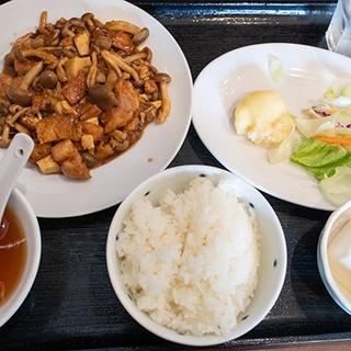 かかしのランチ950円 人気店です。地元の方や常連が多い感じ。チキンの炒め物とマヨネーズ和えのエビチリ?でした。