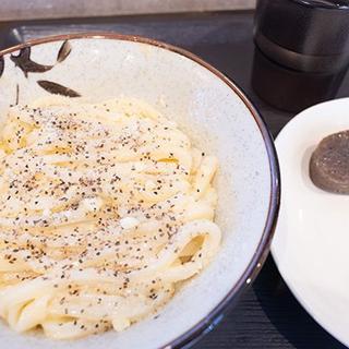 カルボナーラうどんが大失敗 うどんはこしがありよくできている。しかし、カルボナーラが卵の味しかしなかった。こんにゃくを入れて620円。
