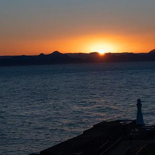 積雪飛ぶ 灯台の向こう側に伊豆半島があり、伊豆半島の根本付近からの日の出です。