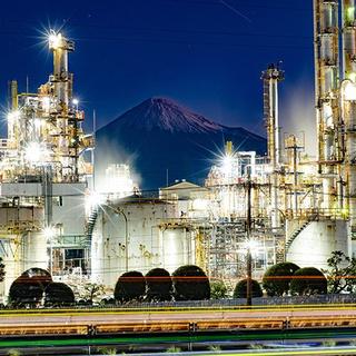 工場夜景と富士山の融合 工場から立ち上る蒸気に暗がりの富士山が隠れていましたが、東に赤みがさすころ、とうとう登場です。