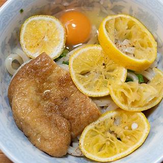 柚子きつねうどんができた。油揚げも自分で味付けして煮込んでみました。以外にうまいのでびっくり、味付けは適当でした。