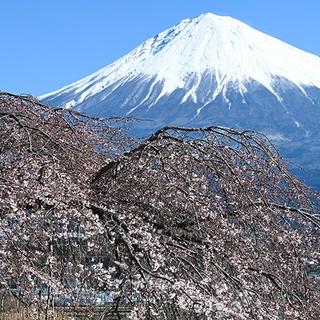 ピンクの桜、白い富士山、青い空。