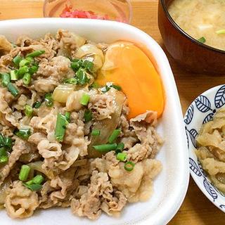 シンプルな牛丼 妻がつけてくれた切り干し大根とみそ汁。牛丼に卵を落として、紅ショウガと一緒にワシワシいただきます。